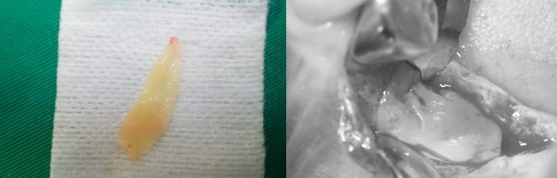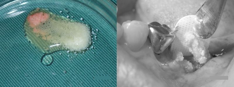 これ自体が骨になるのではありませんが、補填材を入れた上に膜として被せることでバクテリアの侵入を防ぎ、術部の腫れ・出血・痛みを抑え、治癒の促進をはかります。