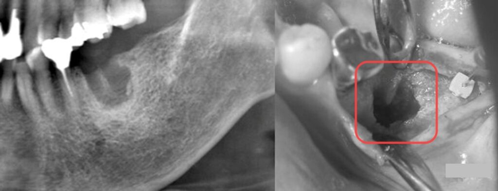 抜歯した跡が大きくえぐれたままでインプラントの土台となる骨がありません。