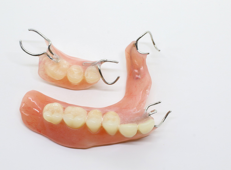 欠損取り外しが可能な人口の歯を、残っている歯に金属のバネで掛けて固定します。取り外し式のため家庭でのお手入れも可能で、支えとなる他の歯を削る量もブリッジより少なく済みます。