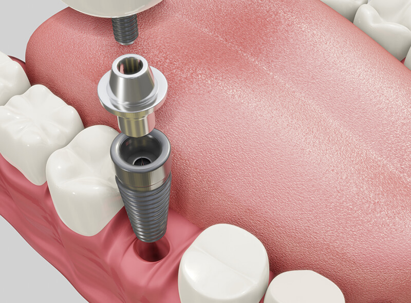 局所麻酔をして、インプラント体を埋めた部分の歯肉を一部取ります。インプラント体の上部を覆う新しい骨を削ってカバーを外し、人工歯の土台となるアバットメントを装着します。その時、仮歯の装着をすることがあります。